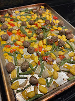For chicken & veggies, I do roughly the same thing. I use boneless skinless chicken thighs, potatoes, carrots, and green beans. Toss everything with olive oil, salt, pepper, minced garlic, and Italian seasoning, plus some fresh lemon zest at 400 for 20-25 minutes or until chicken is done! Clean up is a breeze because it's all in one pan. Win!